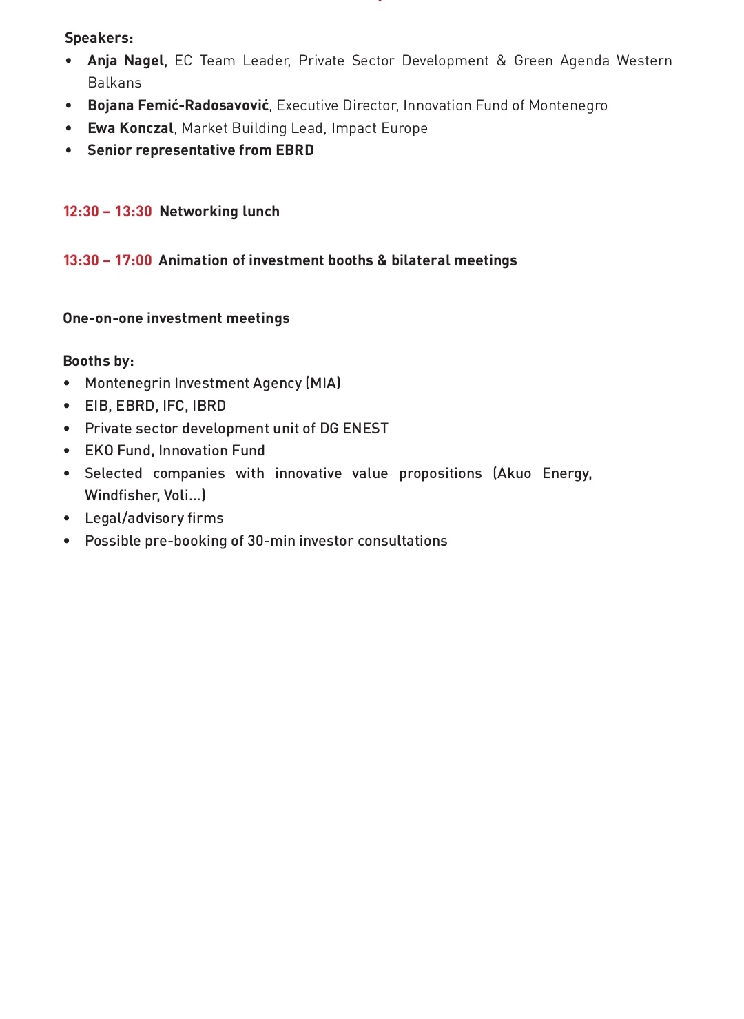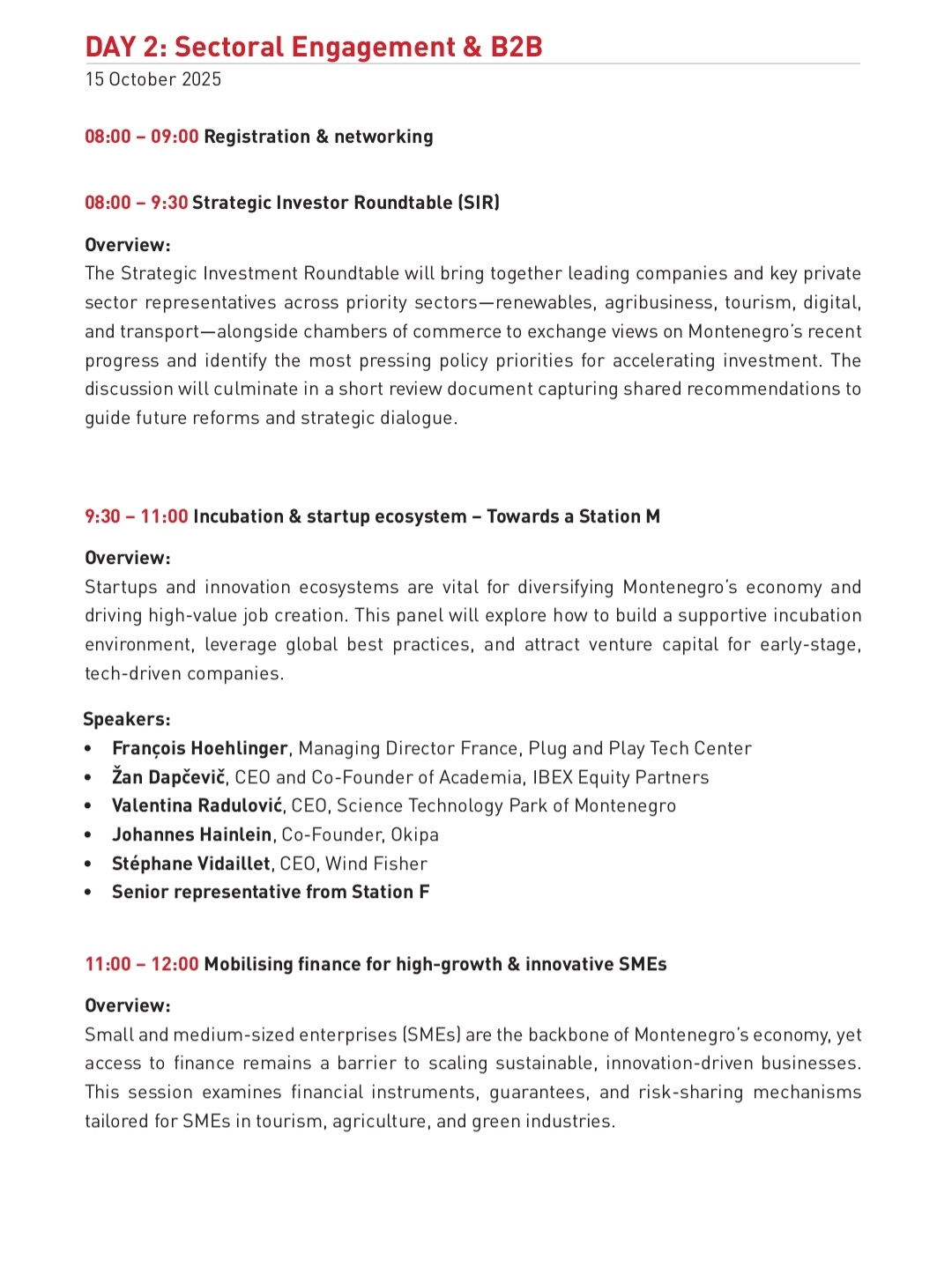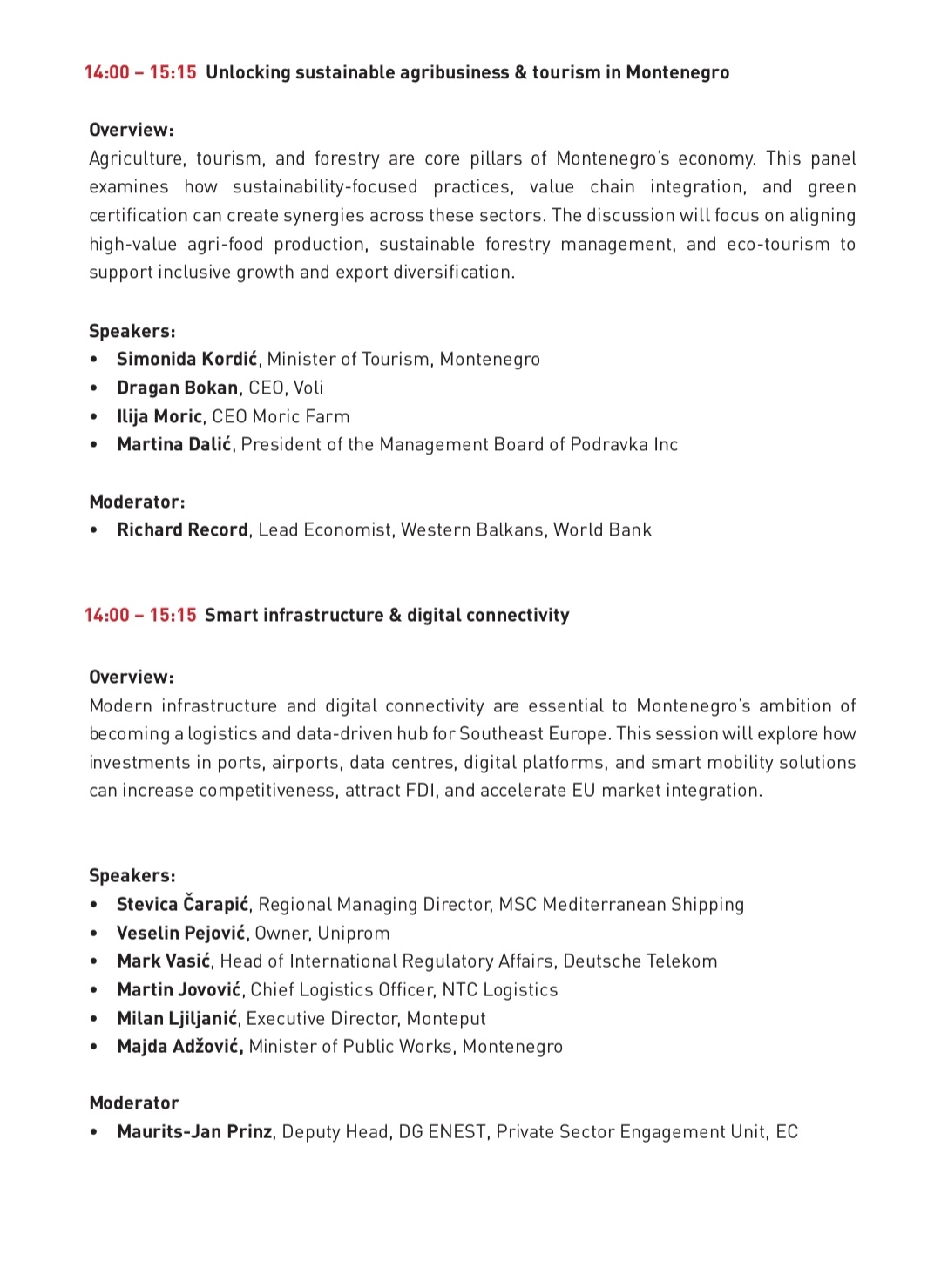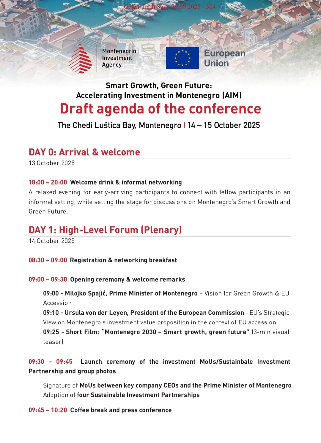 14-15 Ekim 2025 tarihlerinde Karadağ'ın Luštica şehirinde "Akıllı Büyüme, Yeşil Gelecek: Karadağ'da Yatırımın Hızlandırılması" başlıklı bir yatırım konferansı düzenleneceği ve Konferans kapsamında yenilenebilir enerji, sürdürülebilir tarım, turizm, ulaştırma ve bilgi teknolojileri gibi alanlardaki yatırım fırsatlarına değinileceği bildirilmektedir. Konferansa, Karadağ Başbakanı Milojko Spajić'in yanı sıra Avrupa Birliği ve uluslararası kuruluşların üst düzey temsilcilerinin katılımı öngörülmektedir.