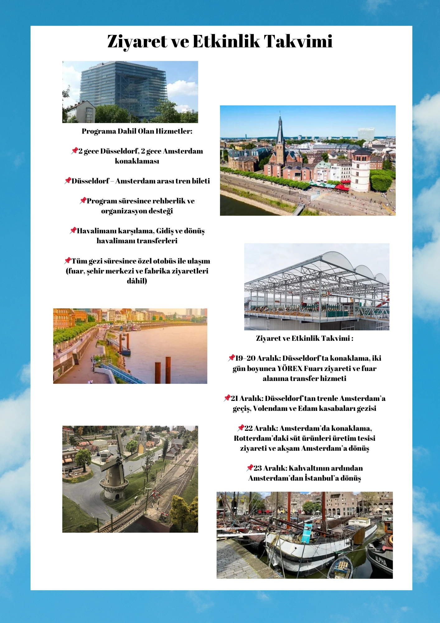 Program kapsamında Düsseldorf’ta fuar ziyareti, Amsterdam’da kültürel geziler, Rotterdam’da süt ürünleri üreticileriyle görüşmeler gerçekleştirilecektir.