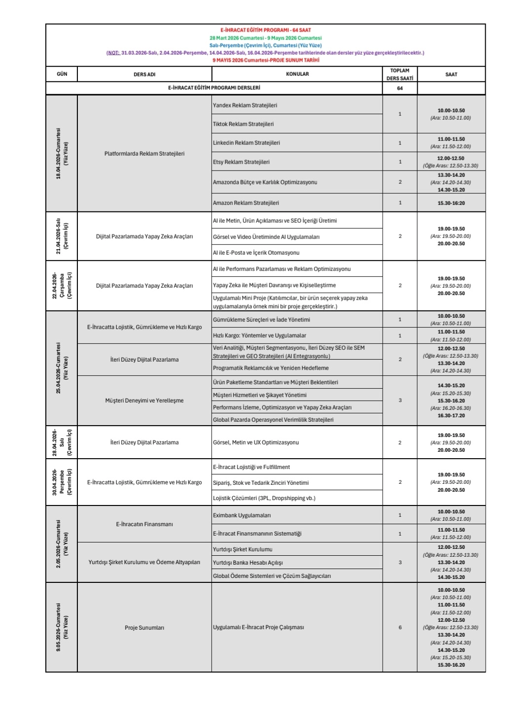 İhracatçıların eğitimine yönelik yürütülen faaliyetlere kurumsal bir nitelik kazandırmak, dış ticaret alanında yetişmiş iş gücünün niteliğini artırmak ve bu süreçte üniversitelerimizin akademik birikiminden azami ölçüde faydalanmak amacıyla Yükseköğretim Kurulu iş birliği ile İhracat Akademisi'nin hayata geçirildiği ve İhracat Akademisi bünyesinde, 28 Mart 2026 - 9 Mayıs 2026 tarihleri arasında Türkiye Odalar ve Borsalar Birliği Ekonomi ve Teknoloji Üniversitesi (TOBB ETÜ) ev sahipliğinde, Türkiye Odalar ve Borsalar Birliği'nin katkılarıyla Ankara'da E-İhracat Eğitim Programı'nın gerçekleştirileceği belirtilmektedir.