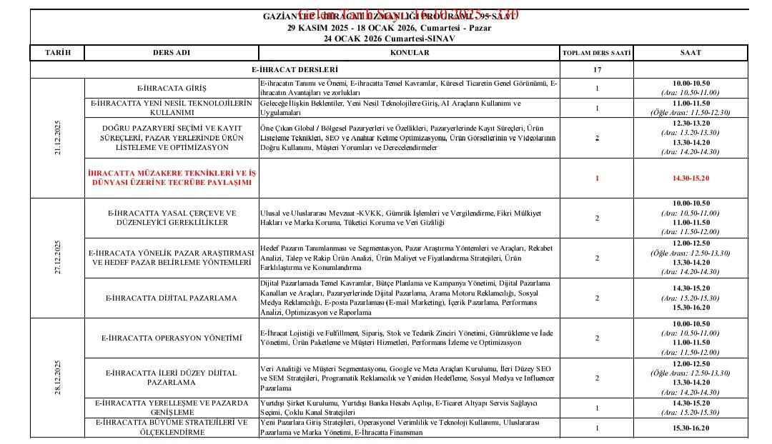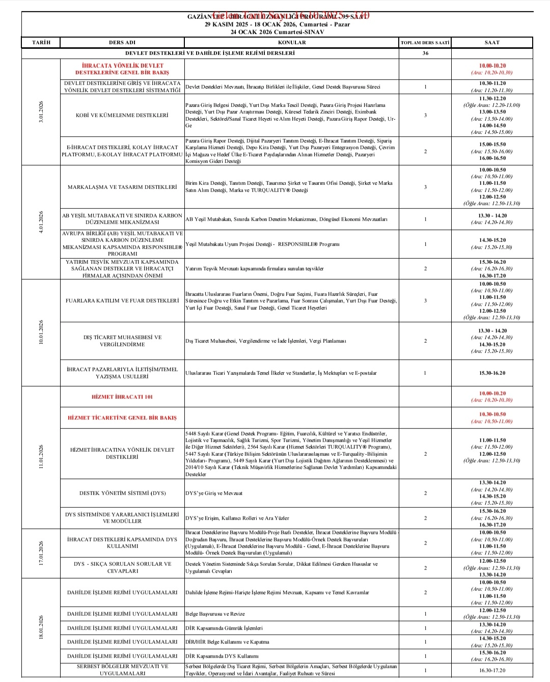 Türkiye Odalar ve Borsalar Birliği'nden Odamıza iletilen 15.10.2025 tarih ve 13171 sayılı yazıda; T.C. Ticaret Bakanlığından gelen yazı ilgide belirtilerek, Gaziantep Üniversitesi Sürekli Eğitim Merkezinde 29 Kasım 2025 – 18 Ocak 2026 tarihleri arasında İhracat Akademisi bünyesinde İhracat Uzmanlığı Eğitim Programı düzenleneceği bildirilmiştir.