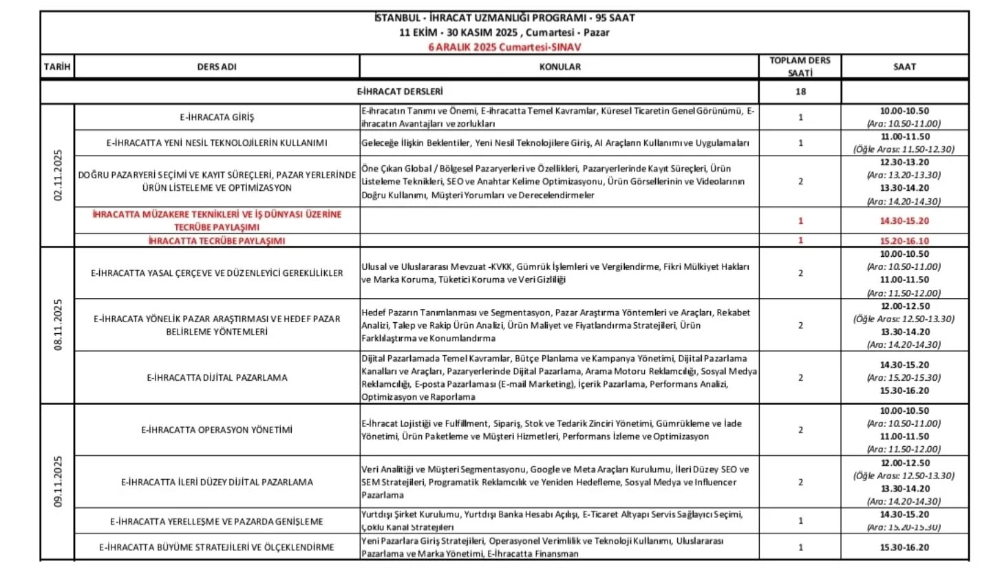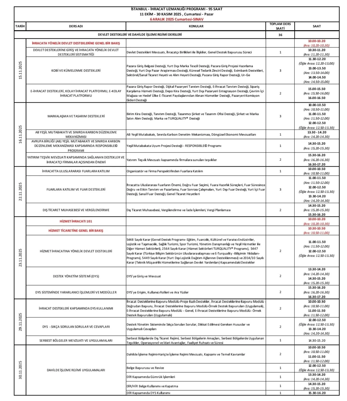 Bu çerçevede; İhracat Akademisi bünyesinde 11 Ekim-30 Kasım 2025 tarihleri arasında Marmara Üniversitesi ev sahipliğinde İstanbul’da İhracat Uzmanlığı Programı gerçekleştirilecektir. Kayıtlar İhracat Akademisi resmi internet sitesi (https://ihracatakademisi.org.tr/) üzerinden alınmaya başlanmış olup programa ilişkin ücret bilgileri ve diğer ayrıntılara aynı adres üzerinden ulaşılabilmektedir.