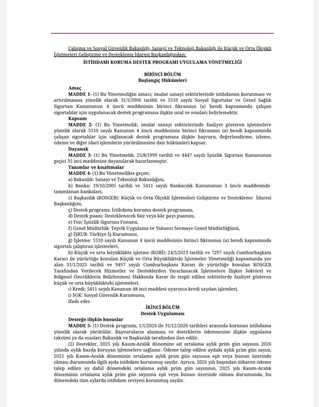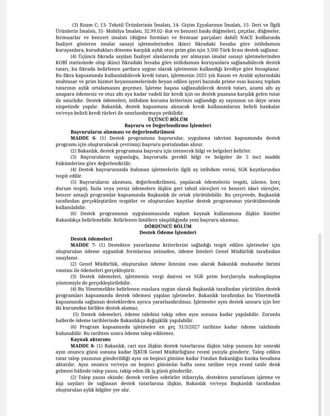 03.03.2026 tarihli ve 33185 sayılı Resmi Gazete'de yayımlanan "İstihdamı Koruma Destek Programı Uygulama Yönetmeliği" kapsamında, imalat sanayi sektörlerinde istihdamın korunması ve artırılmasına yönelik olarak, işletme büyüklüğü şartı aranmaksızın NACE Kodu Kısım C; 13- Tekstil Ürünlerinin İmalatı, 14- Giyim Eşyalarının İmalatı, 15- Deri ve İlgili Ürünlerin İmalatı, 31- Mobilya İmalatı, 32.99.02- Kot ve benzeri baskı düğmeleri, çıtçıtlar, düğmeler, fermuarlar ve benzeri imalatı (düğme formları ve fermuar parçaları dahil) kodlarında faaliyet gösteren imalat sanayi işletmelerinden istihdamını koruyanlara, korudukları döneme karşılık aylık otuz prim gün için 3.500 Türk lirasına kadar destek sağlanacağı belirtilmiştir.
