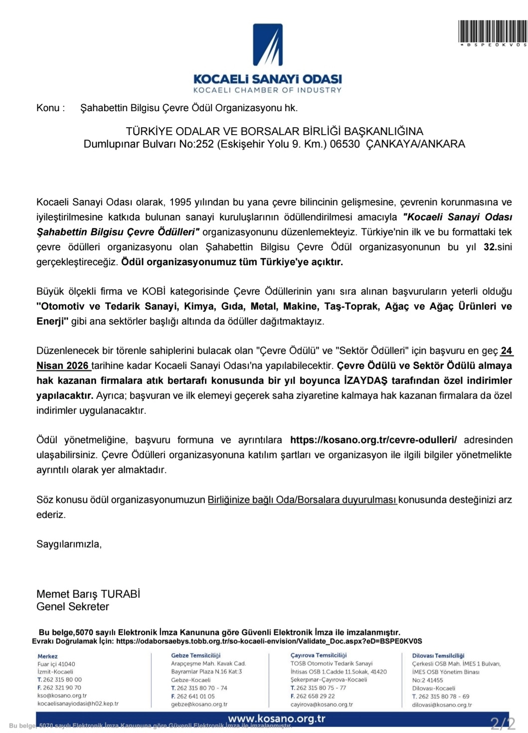 Kocaeli Sanayi Odası Şahabettin Bilgisu Çevre Ödülleri Başvuruları