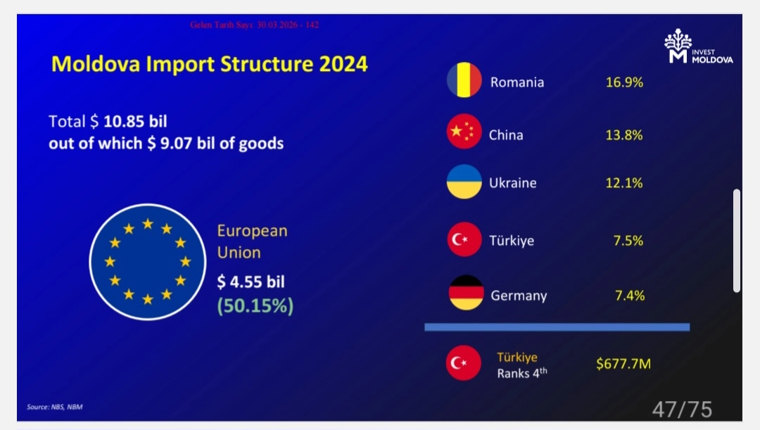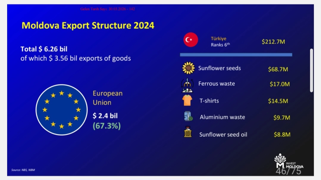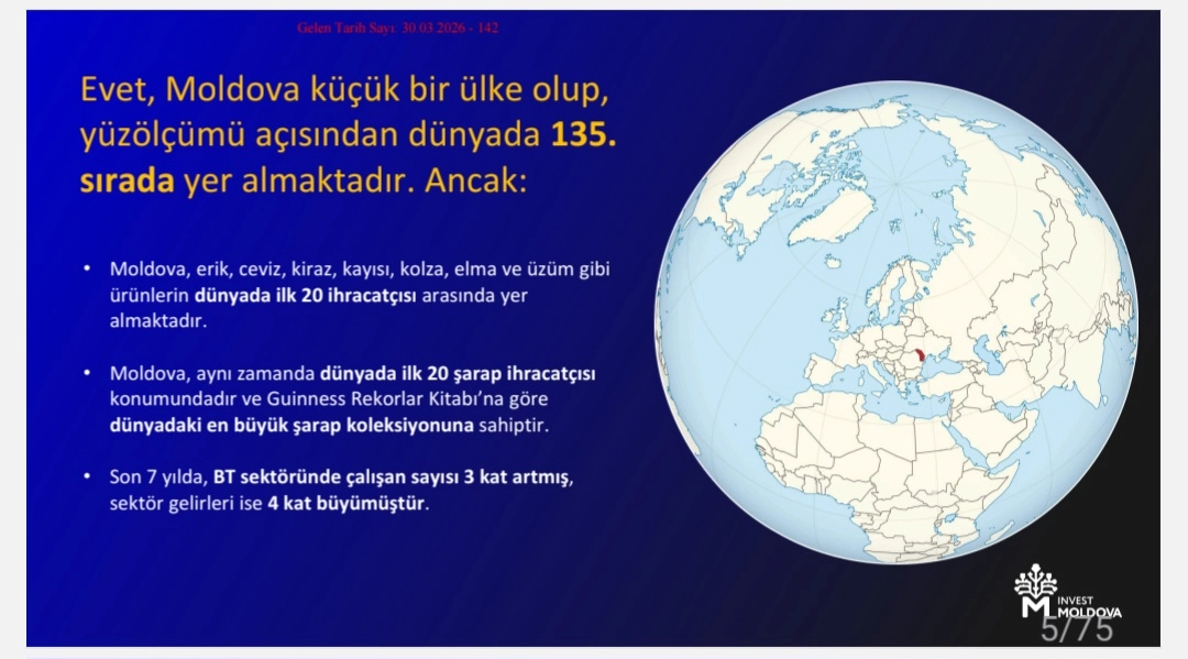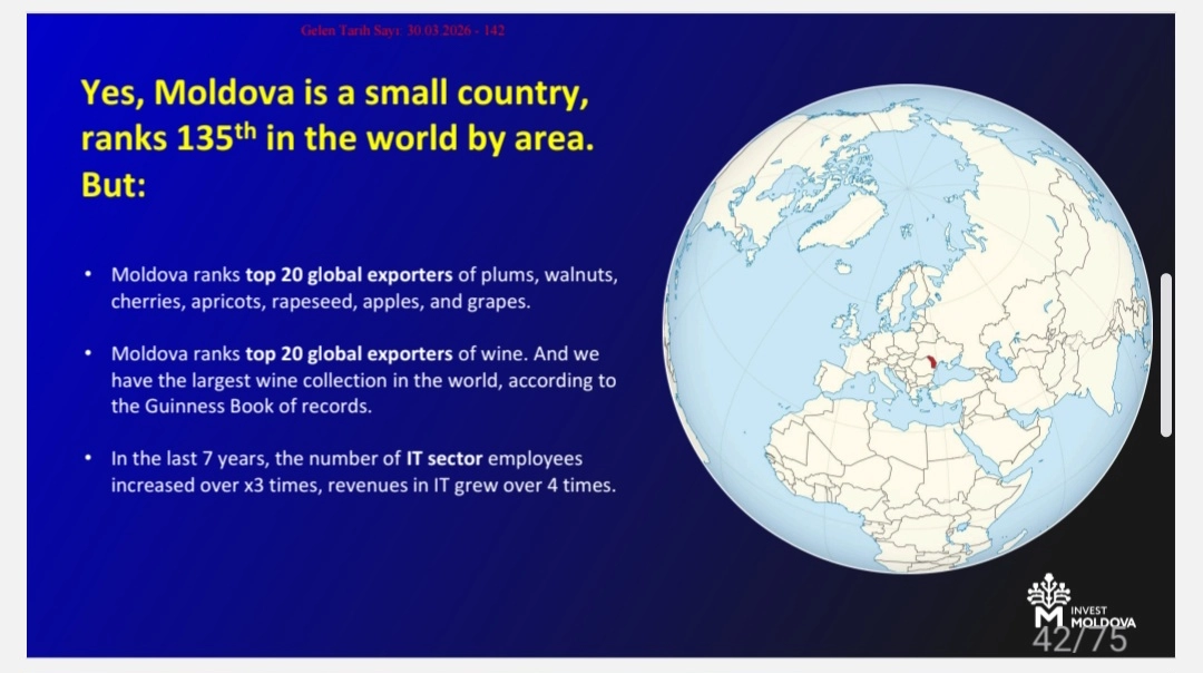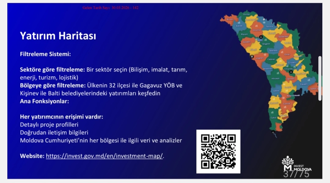 Türkiye Odalar ve Borsalar Birliği’nce tarafımıza iletilen yazıda, Moldova Cumhuriyeti Ankara Büyükelçiliği’nin ilgili yazısına atfen, Moldova Cumhuriyeti'nin demografi, ekonomi, yönetişim ve temel göstergelerine ilişkin Türkçe ve İngilizce sunumlar paylaşılmaktadır.
