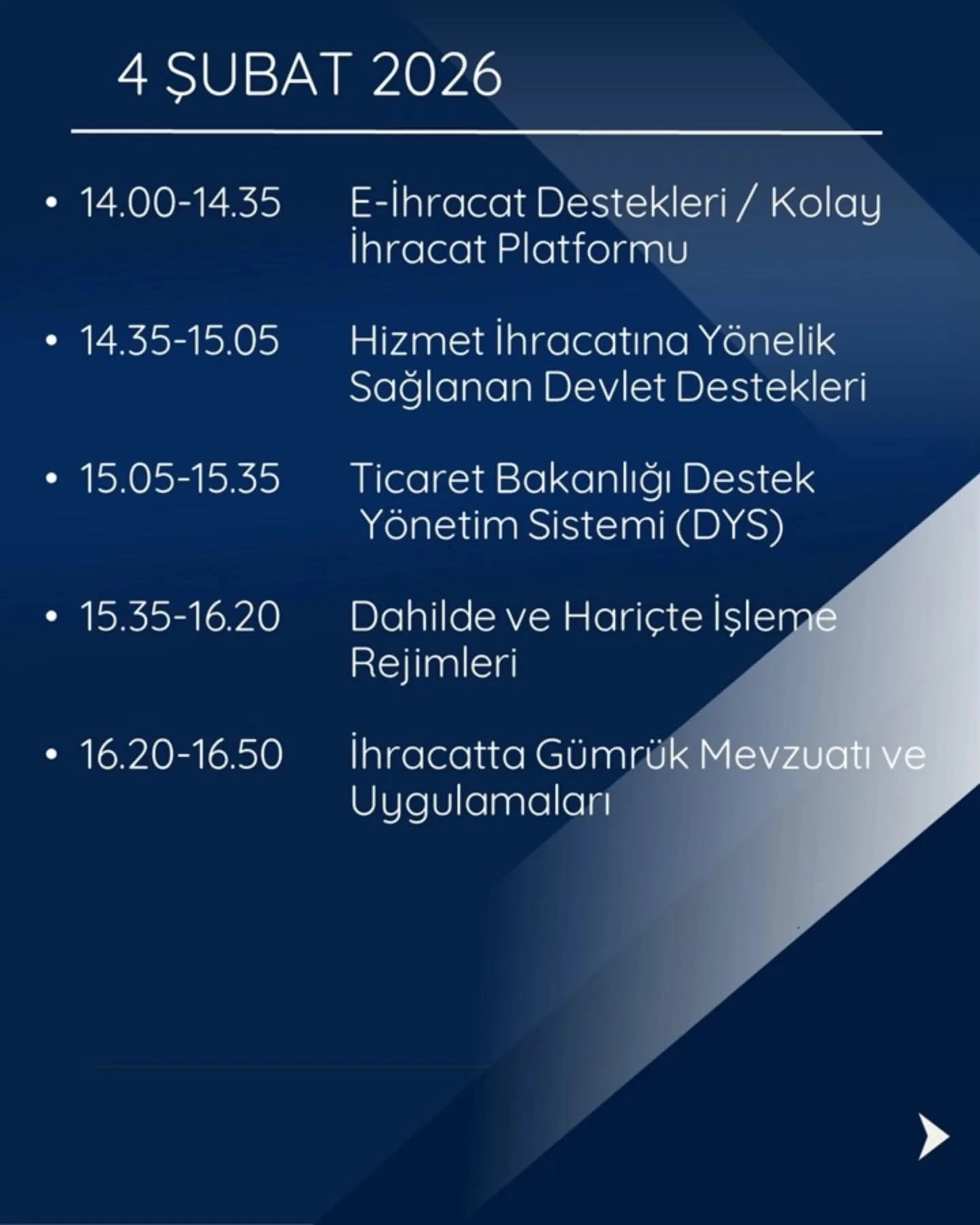 T.C. Ticaret Bakanlığı koordinasyonunda, Türkiye genelindeki iş çevrelerinin ihracat süreçlerine ilişkin olarak bilgilendirilmesini teminen düzenlenen “T.C. Ticaret Bakanlığı İhracat Süreçleri ve Devlet Destekleri Eğitim Programı” 3-4-5 Şubat 2026 tarihlerinde çevrim içi olarak gerçekleştirilecektir.