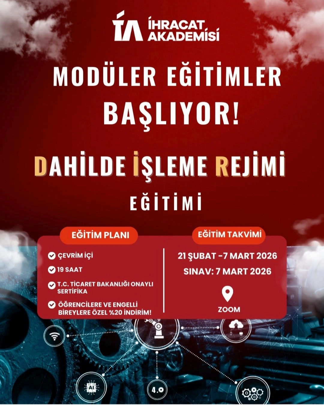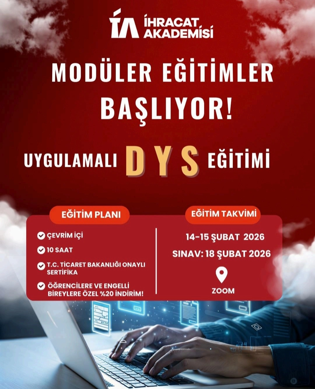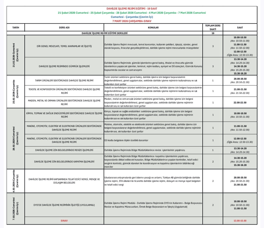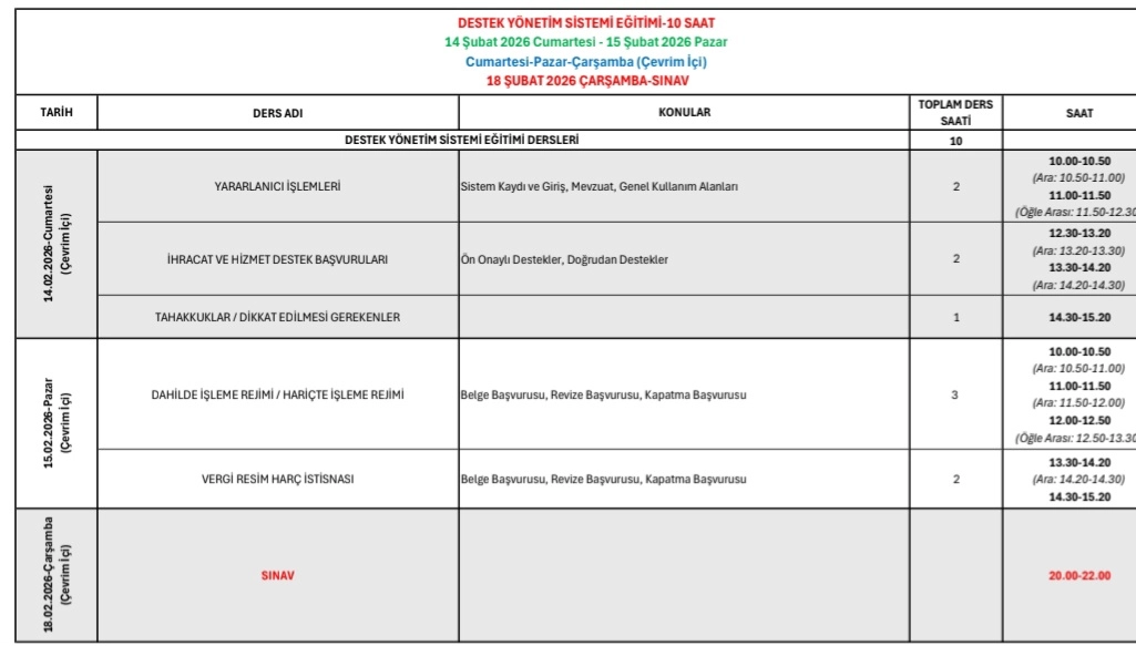 İlgide kayıtlı yazıda, Ticaret Bakanlığı tarafından 14-15 Şubat 2026 tarihlerinde Destek Yönetim Sistemi (DYS) Eğitim Programı'nın ve 21 Şubat-7 Mart 2026 tarihlerinde ise Dahilde İşleme Rejimi (DİR) Eğitim Programı'nın çevrimiçi olarak gerçekleştirileceği bilgisi verilmiştir. Yazıda, 18 Şubat 2026 tarihinde DYS Eğitim Programı sınavı, 7 Mart 2026 tarihinde de DİR Eğitim Programı sınavının çevrim içi ve çoktan seçmeli olarak yapılacağı açıklanmış olup, katılımcılara Bakanlık onaylı Katılım/Başarı Belgesi verileceği belirtilmiştir.