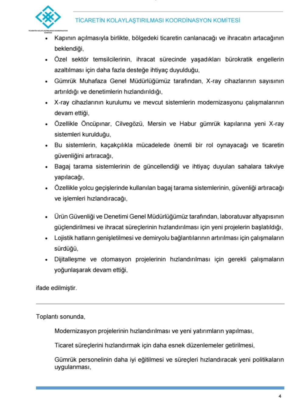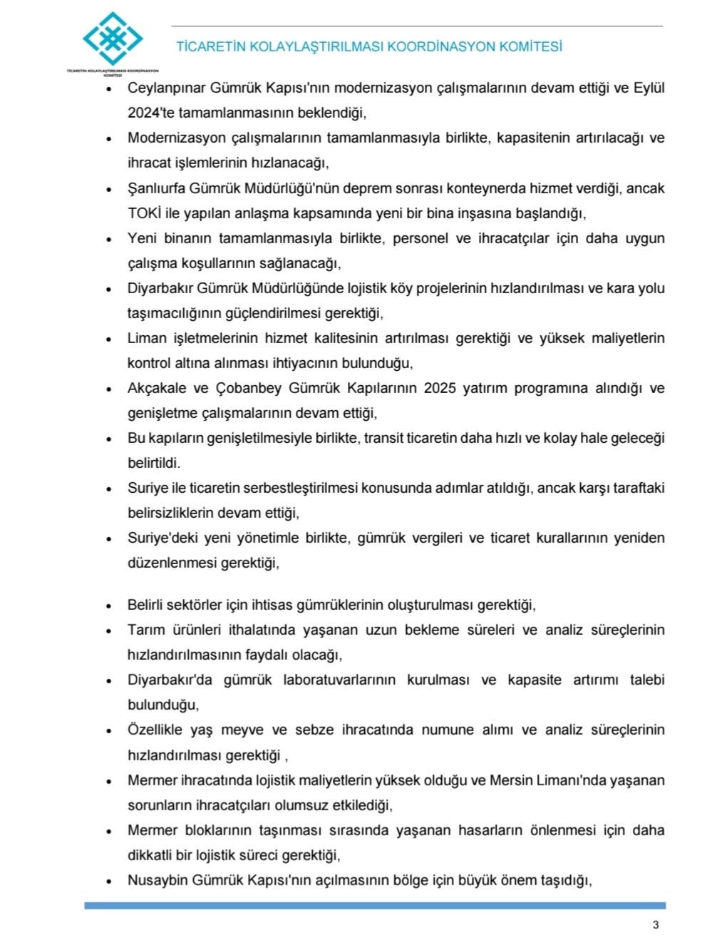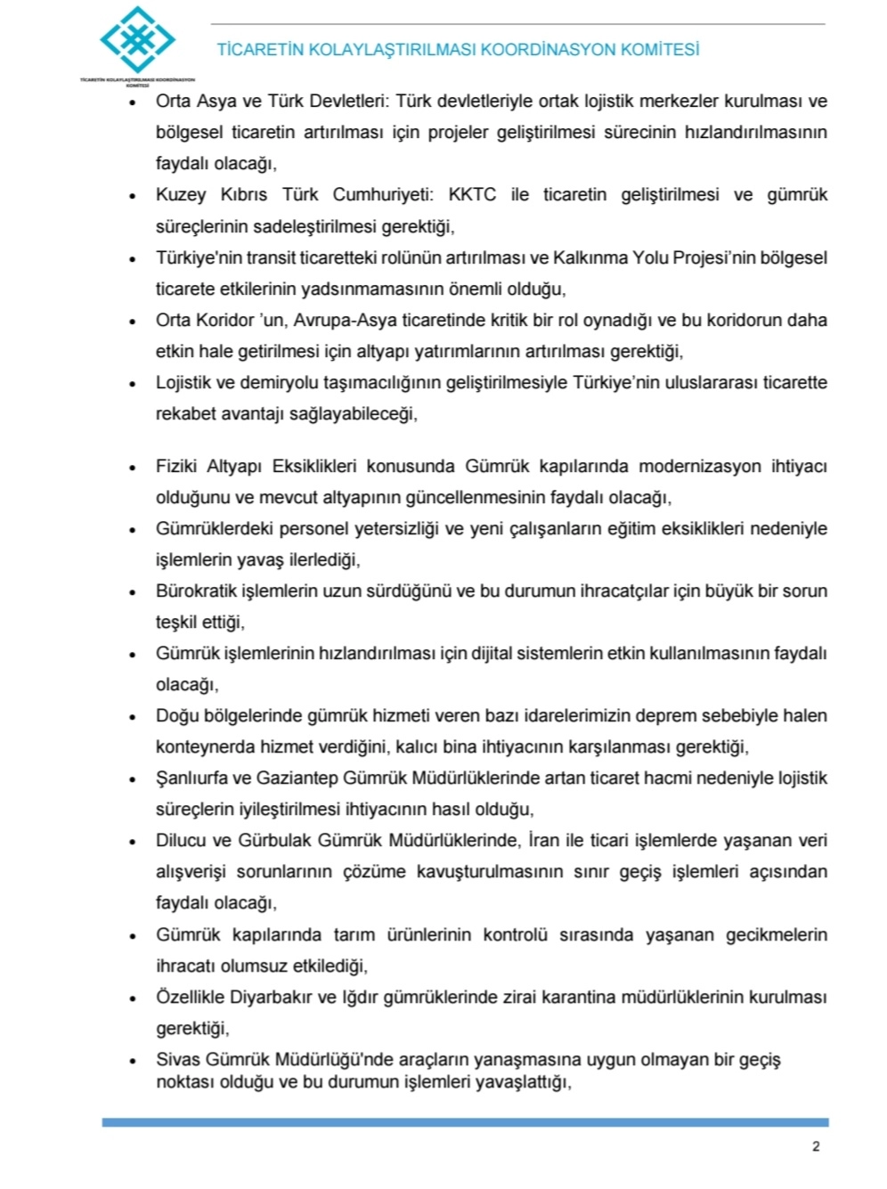Cumhurbaşkanlığı Genelgesi ile kurulan Ticaretin Kolaylaştırılması Koordinasyon Komitesi'nin çalışmaları kapsamında, ticaretin kolaylaştırılması konusunda farkındalığın artırılmasını teminen Gümrük ve Dış Ticaret Bölge Müdürlükleri katılımı, sivil toplum örgütleri ve diğer ilgili kamu idareleri temsilcilerinin katkısı ile yıllık bölgesel istişare toplantılarının düzenlendiği belirtilmiştir.