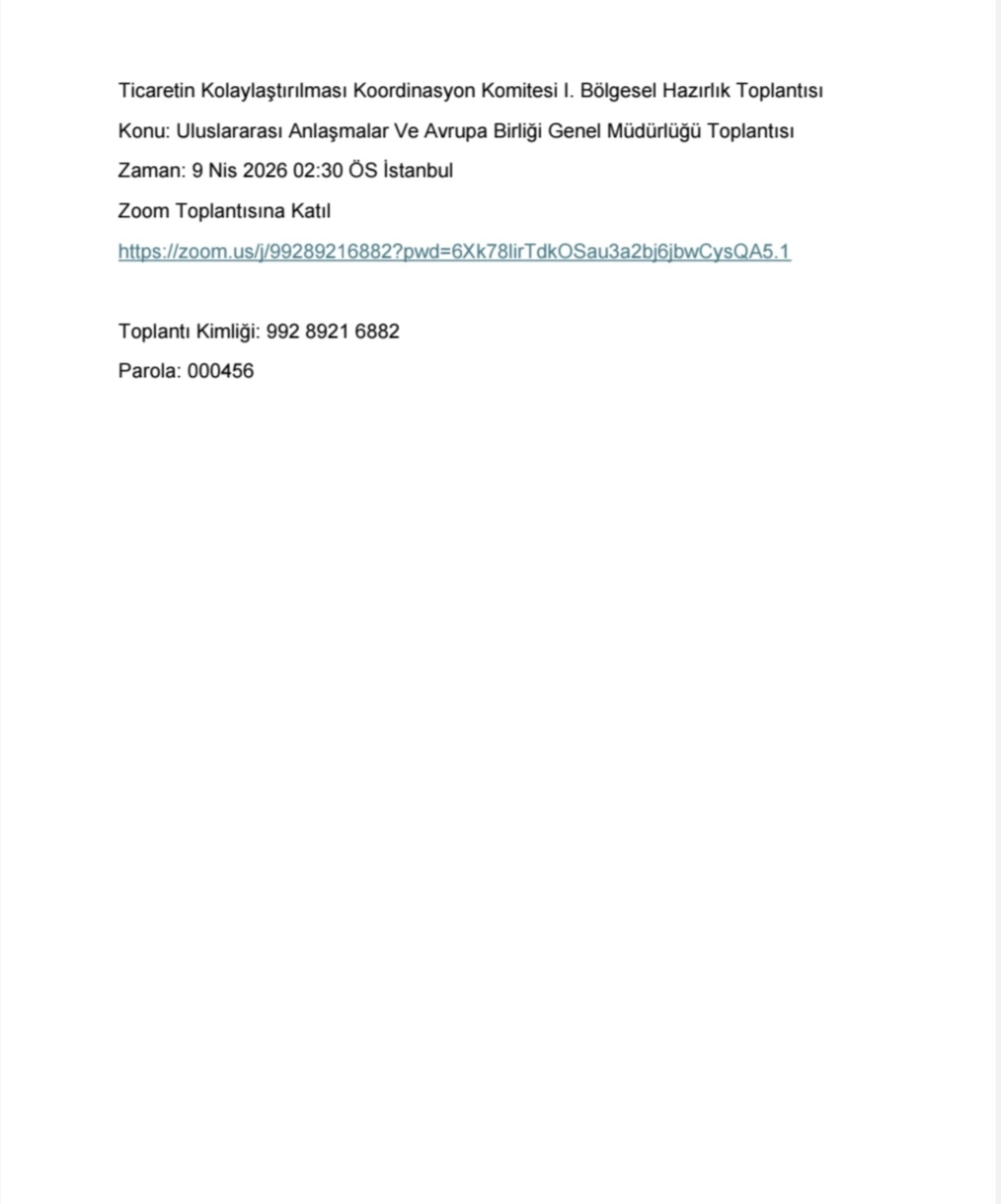 2025 yılında düzenlenen bölgesel istişare toplantılarına ait toplantı notu ve toplantıya katılıma ilişkin gerekli erişim bilgileri iletilmiş olup, toplantıya katılım sağlaması uygun görülen Oda/Borsa temsilcilerinin isim, unvan ve iletişim bilgilerinin, 5 Nisan 2026 tarihine kadar e-posta ile ahd@ticaret.gov.tr adresine iletilmesi edilmiştir.