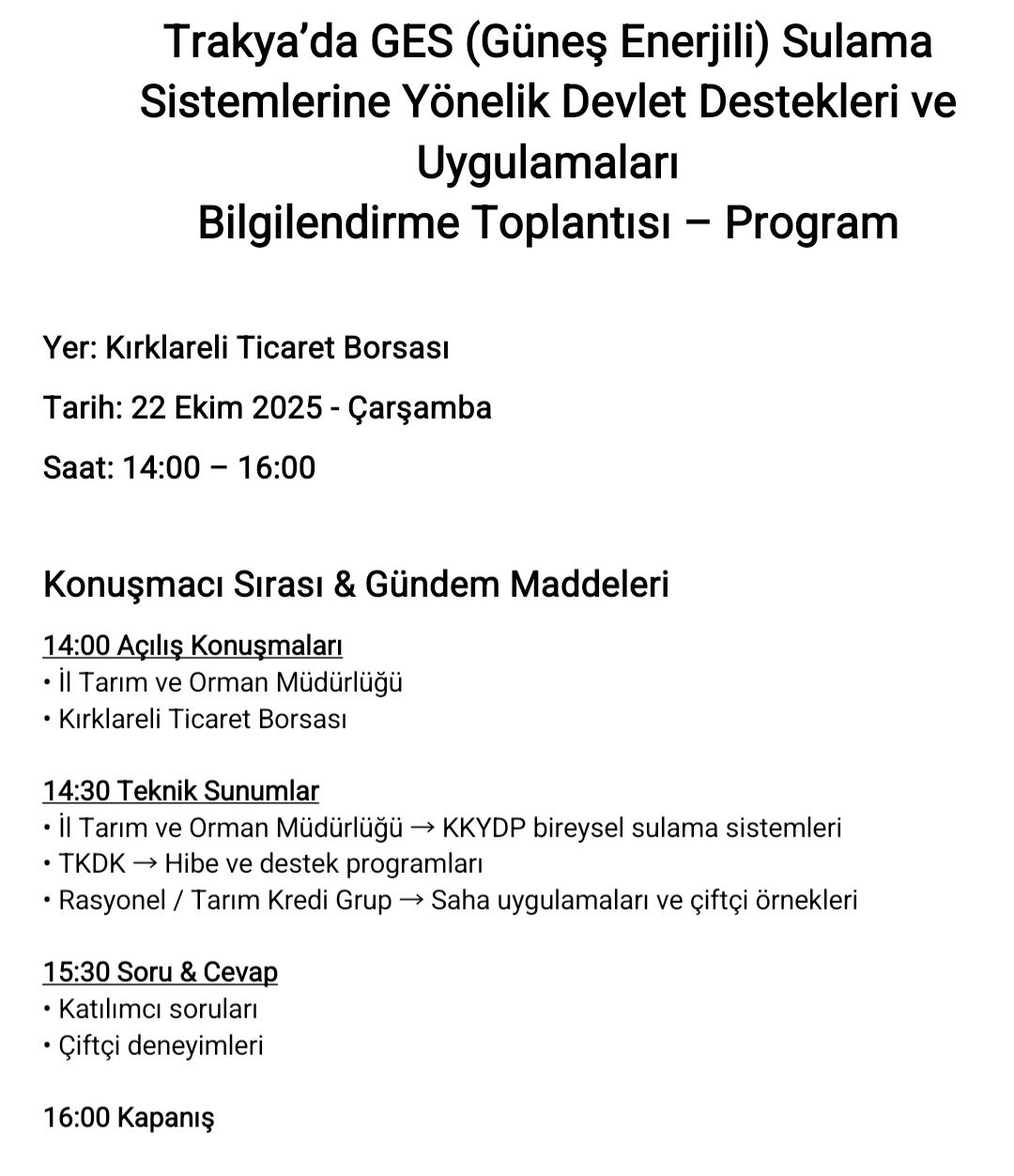 Trakya (Edirne, Kırklareli, Tekirdağ) bölgesindeki üreticilere yönelik mevcut devlet desteklerini ve uygulama koşullarını paylaşmak, başvuru süreçlerini, maliyet kalemlerini ve saha örneklerini uygulamalı göstermek, bölgesel ortak hareket planı ve pilot uygulama adımlarını belirlemek, bölgemizde tarımsal üretimde enerji maliyetlerini düşürmek ve sürdürülebilir sulama altyapısını yaygınlaştırmak amacıyla Trakya’da GES (Güneş Enerjili) Sulama Sistemlerine Yönelik Devlet Destekleri ve Uygulamaları konulu bir bilgilendirme toplantısı düzenliyoruz. Toplantıda; Tarım ve Orman Bakanlığı, TKDK/IPARD ve il müdürlüklerinin sunduğu hibe/teşvikler, başvuru süreçleri, yerel uygulama örnekleri ve finansman modelleri paylaşılacaktır.
