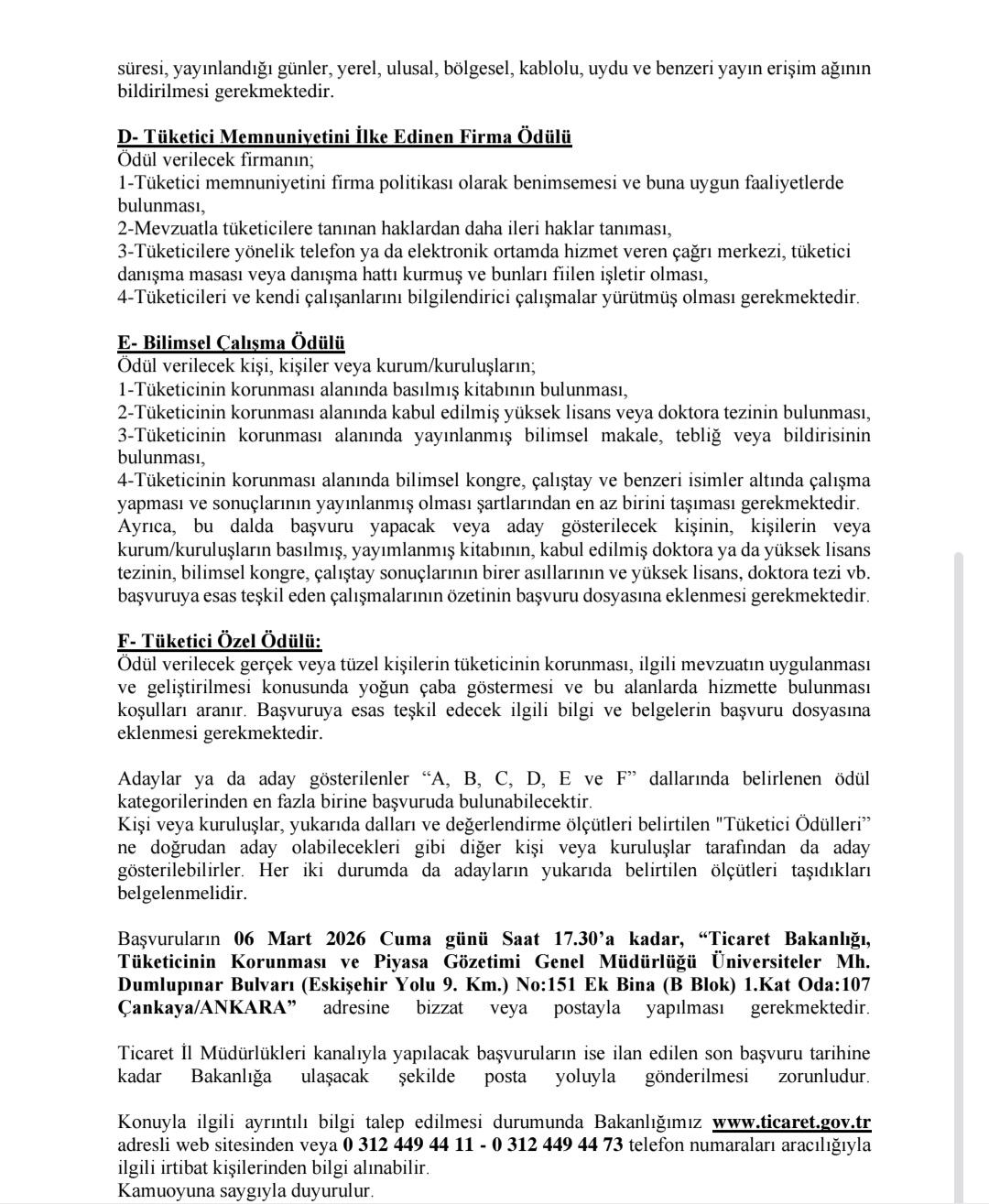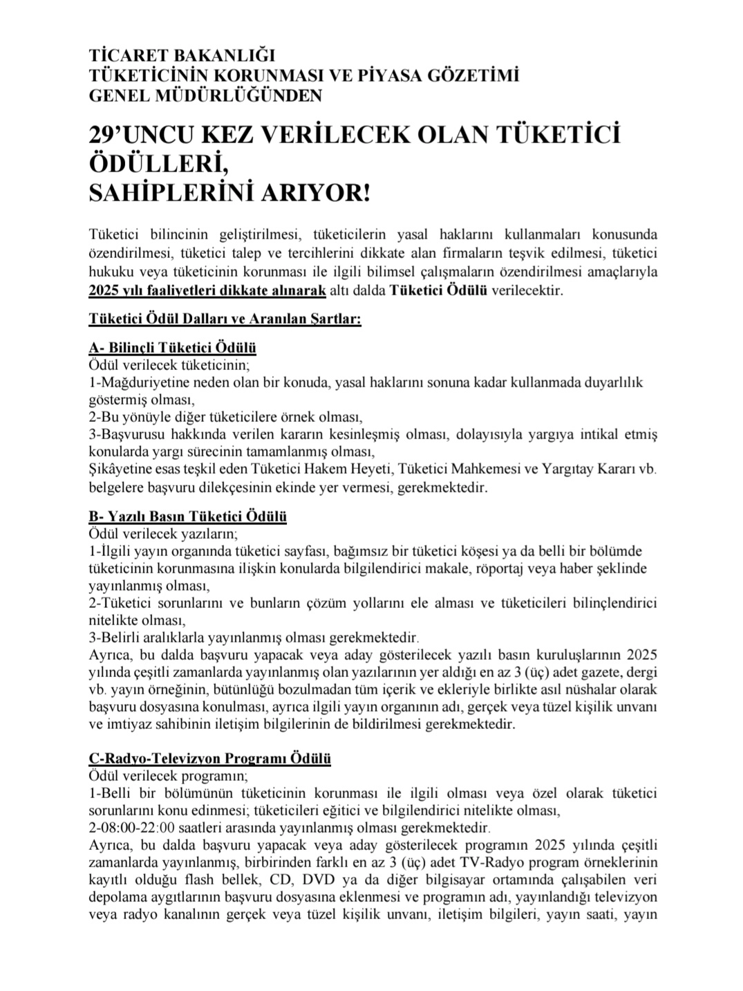 2025 yılı faaliyetleri dikkate alınarak gerçekleştirilecek olan 29. Geleneksel Tüketici Ödülleri’nin ilan metni ekte takdim edilmekte olup, https://tuketici.ticaret.gov.tr/ internet adresinde de yayımlanmıştır.