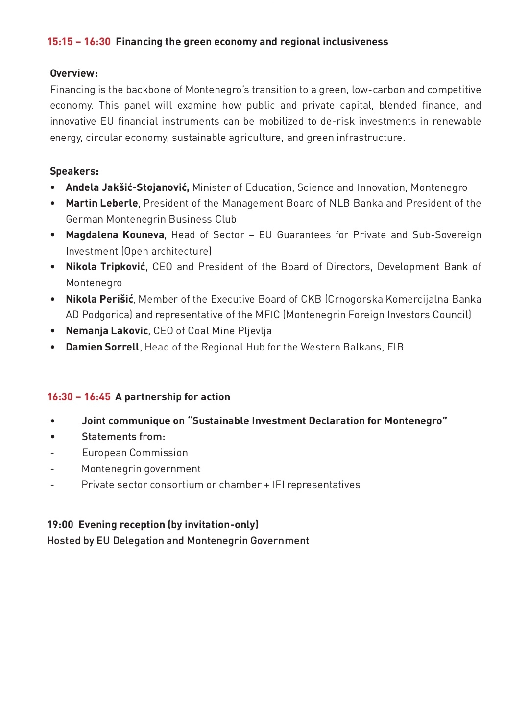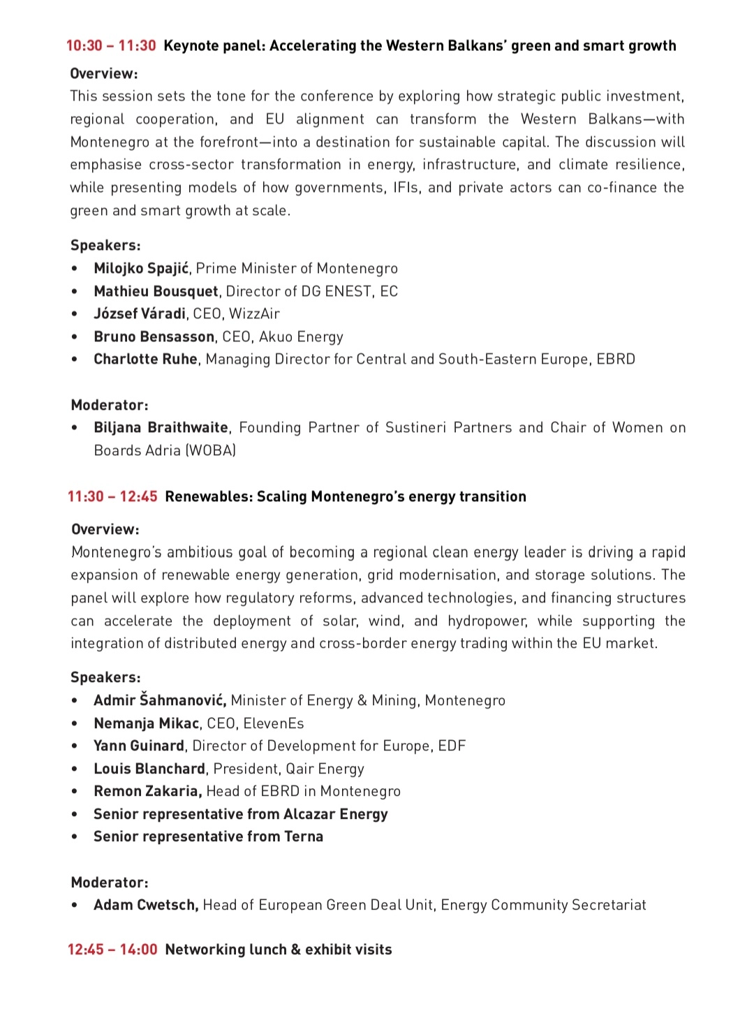14-15 Ekim 2025 tarihlerinde Karadağ'ın Luštica şehirinde "Akıllı Büyüme, Yeşil Gelecek: Karadağ'da Yatırımın Hızlandırılması" başlıklı bir yatırım konferansı düzenleneceği ve Konferans kapsamında yenilenebilir enerji, sürdürülebilir tarım, turizm, ulaştırma ve bilgi teknolojileri gibi alanlardaki yatırım fırsatlarına değinileceği bildirilmektedir. Konferansa, Karadağ Başbakanı Milojko Spajić'in yanı sıra Avrupa Birliği ve uluslararası kuruluşların üst düzey temsilcilerinin katılımı öngörülmektedir.