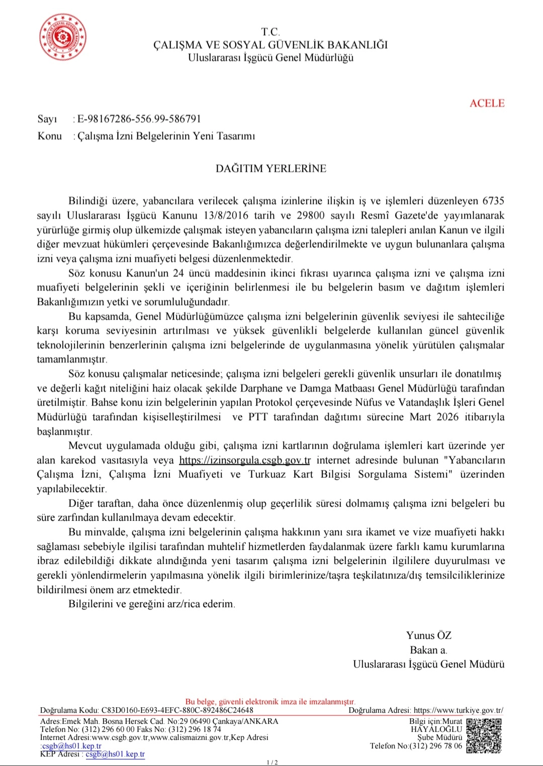 Bu çerçevede, tasarlanan izin belgelerinin basım, kişiselleştirme ve dağıtım işlemlerinin Mart 2026 itibarıyla başladığı, mevcut uygulamada da olduğu gibi çalışma izin kartlarının doğrulama işlemlerinin kart üzerinde yer alan karekod aracılığıyla veya https://izinsorgula.csgb.gov.tr internet adresinde bulunan "Yabancıların Çalışma İzni, Çalışma İzni Muafiyeti ve Turkuaz Kart Bilgisi Sorgulama Sistemi" üzerinden yapılabileceği belirtilmektedir.