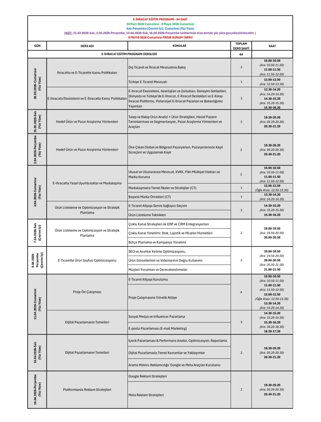 İhracatçıların eğitimine yönelik yürütülen faaliyetlere kurumsal bir nitelik kazandırmak, dış ticaret alanında yetişmiş iş gücünün niteliğini artırmak ve bu süreçte üniversitelerimizin akademik birikiminden azami ölçüde faydalanmak amacıyla Yükseköğretim Kurulu iş birliği ile İhracat Akademisi'nin hayata geçirildiği ve İhracat Akademisi bünyesinde, 28 Mart 2026 - 9 Mayıs 2026 tarihleri arasında Türkiye Odalar ve Borsalar Birliği Ekonomi ve Teknoloji Üniversitesi (TOBB ETÜ) ev sahipliğinde, Türkiye Odalar ve Borsalar Birliği'nin katkılarıyla Ankara'da E-İhracat Eğitim Programı'nın gerçekleştirileceği belirtilmektedir.