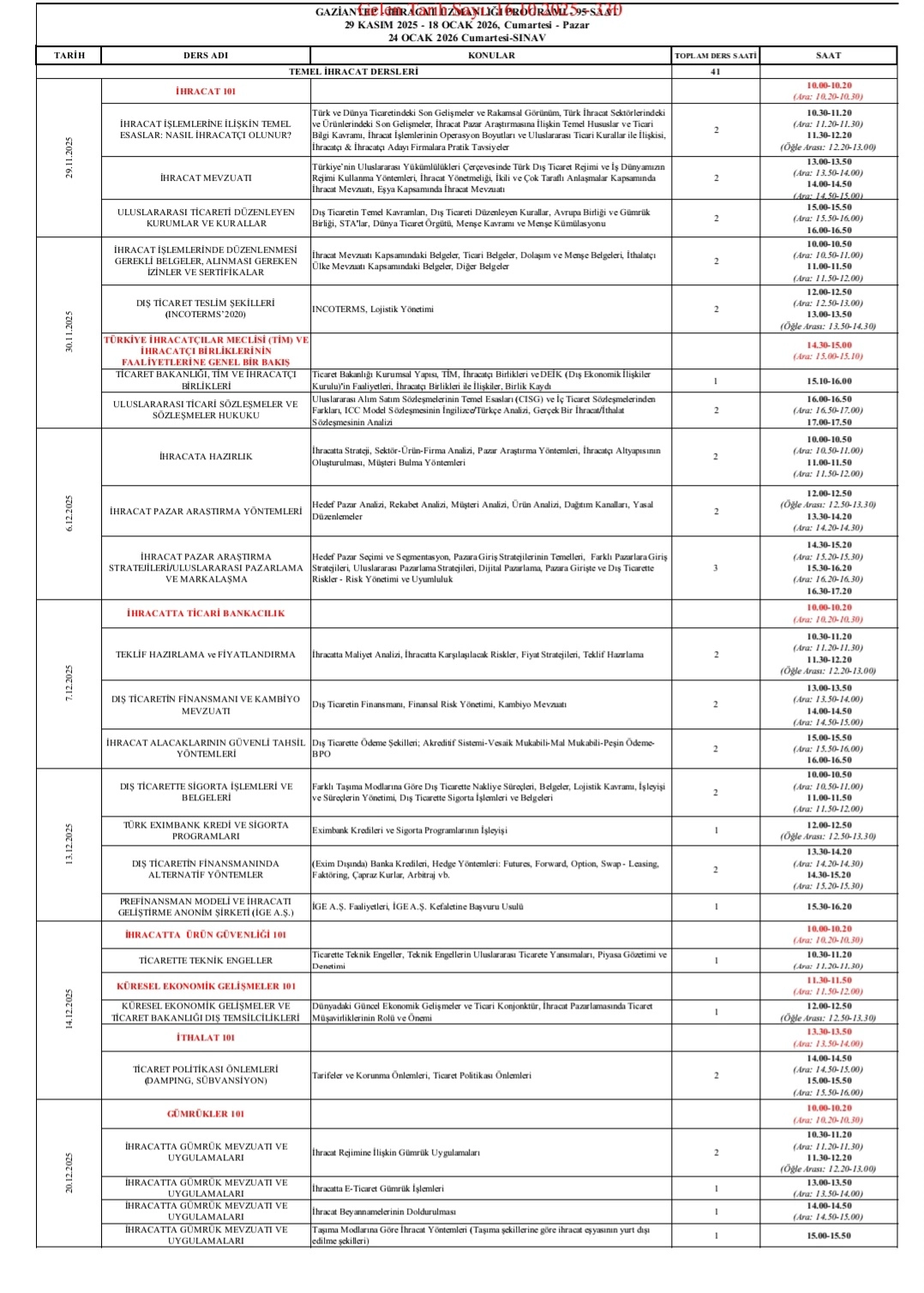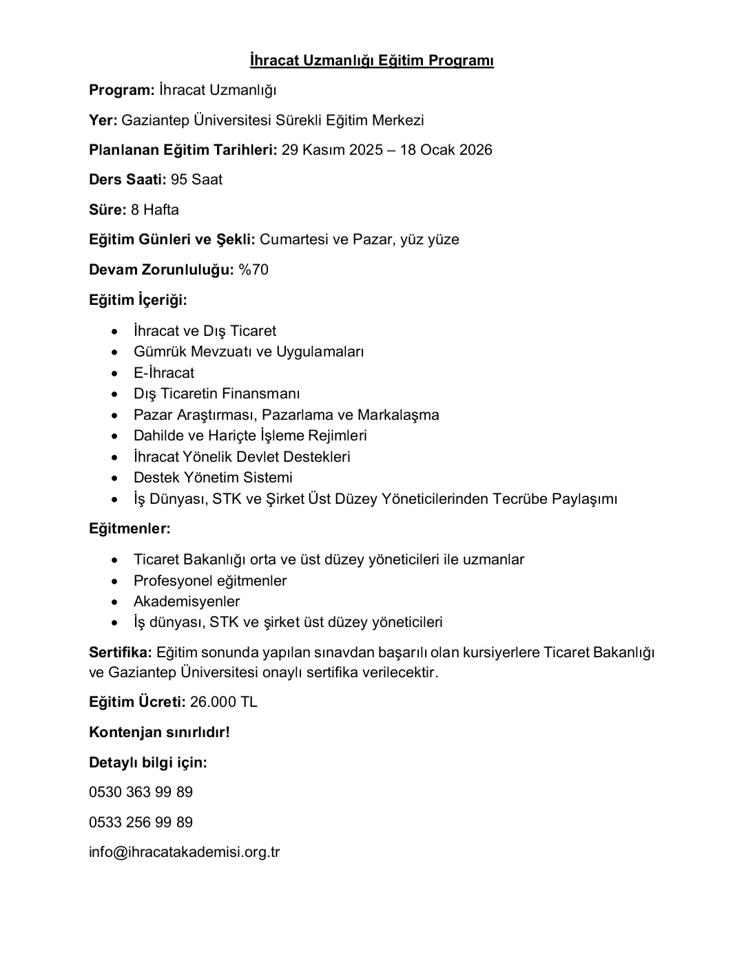 Türkiye Odalar ve Borsalar Birliği'nden Odamıza iletilen 15.10.2025 tarih ve 13171 sayılı yazıda; T.C. Ticaret Bakanlığından gelen yazı ilgide belirtilerek, Gaziantep Üniversitesi Sürekli Eğitim Merkezinde 29 Kasım 2025 – 18 Ocak 2026 tarihleri arasında İhracat Akademisi bünyesinde İhracat Uzmanlığı Eğitim Programı düzenleneceği bildirilmiştir.