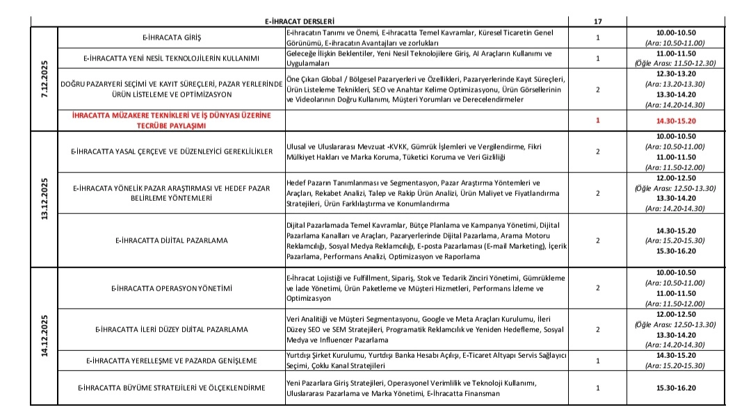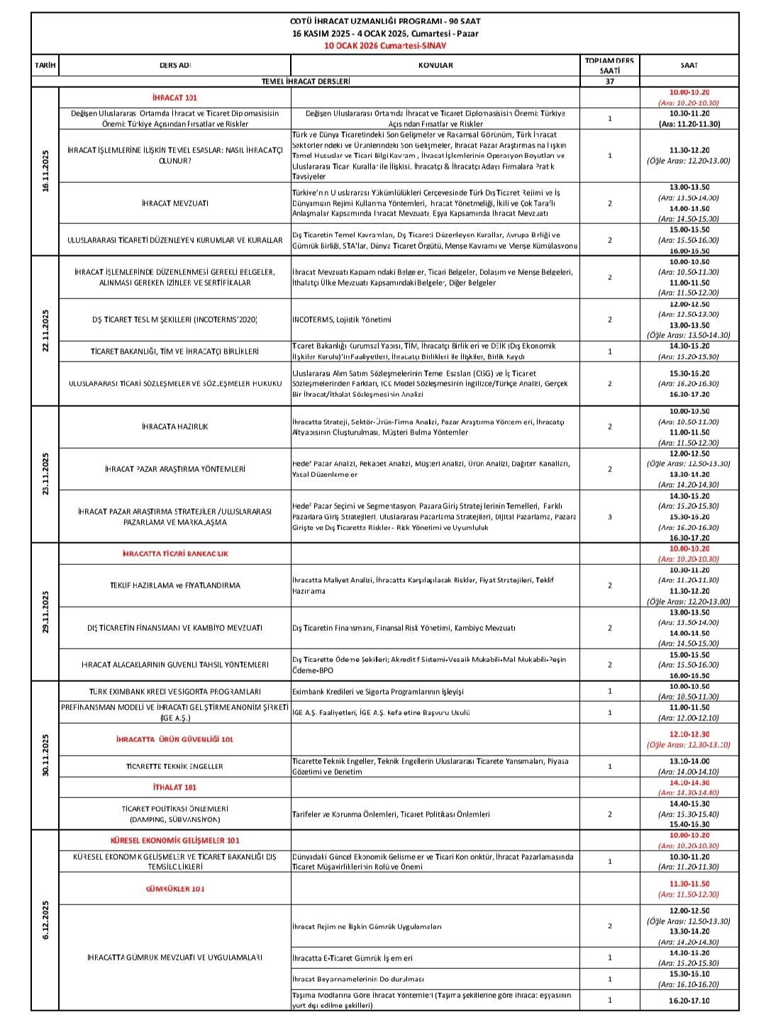 Türkiye Odalar ve Borsalar Birliğinden Odamıza iletilen 14.10.2025 tarih ve 13071 sayılı yazıda; T.C. Ticaret Bakanlığından gelen yazı ilgide belirtilerek, Orta Doğu Teknik Üniversitesi ev sahipliğinde Ankara’da 16 Kasım 2025 – 4 Ocak 2026 tarihleri arasında İhracat Akademisi bünyesinde İhracat Uzmanlığı Eğitim Programı düzenleneceği bildirilmiştir.