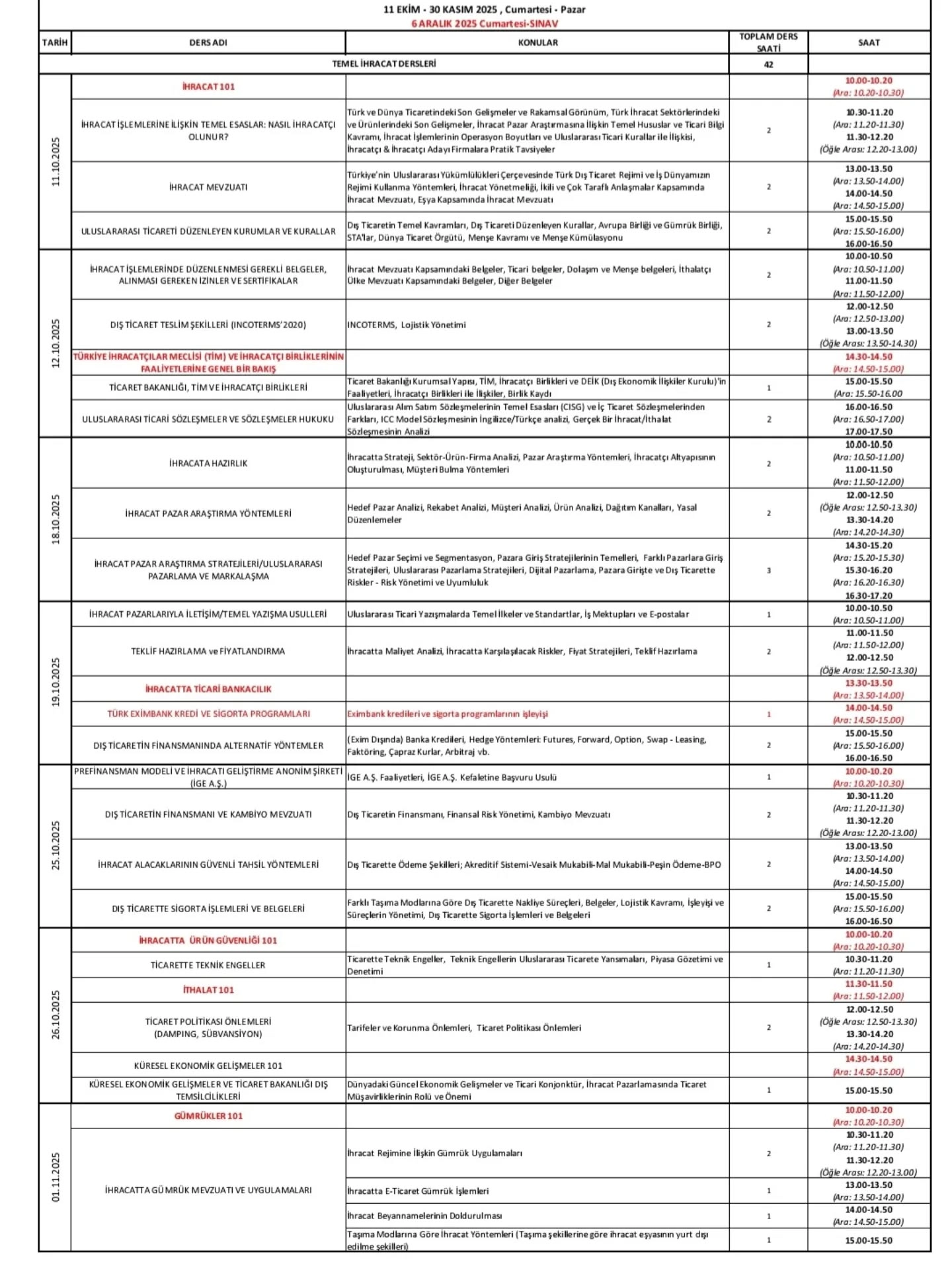 Bu çerçevede; İhracat Akademisi bünyesinde 11 Ekim-30 Kasım 2025 tarihleri arasında Marmara Üniversitesi ev sahipliğinde İstanbul’da İhracat Uzmanlığı Programı gerçekleştirilecektir. Kayıtlar İhracat Akademisi resmi internet sitesi (https://ihracatakademisi.org.tr/) üzerinden alınmaya başlanmış olup programa ilişkin ücret bilgileri ve diğer ayrıntılara aynı adres üzerinden ulaşılabilmektedir.