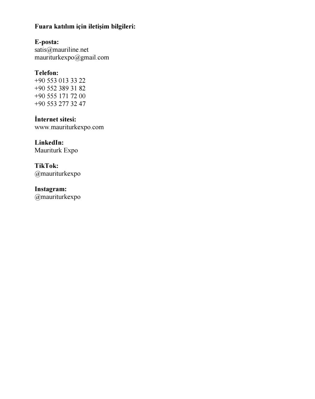 Nuakşot Ticaret Müşavirliğimizin bir talebina atfen Ticaret Bakanlığından alınan yazıda; 27-29 Nisan 2026 tarihleri arasında Moritanya'nın başkenti Nuakşot'taki Sheraton Oteli'nde ilk kez Moritanya - Türkiye Ticaret Fuarının (MAURITURK EXPO) gerçekleştirileceği ve söz konusu fuarın iki ülke iş insanları arasında ticari ortaklıkların tesis edilmesi açısından seçkin bir fırsat teklif ettiği; fuar kapsamında çeşitli bozulma sergileneceği ve iş insanları arasında ikili iş ilişkilerinin düzenlenmesinin planlandığı; bunun yanı sıra fuarın, Türk imalatçılarının Moritanya ve Batı Afrika pazarlarına doğrudan erişime izin verildiği belirtilmektedir.