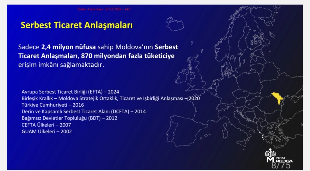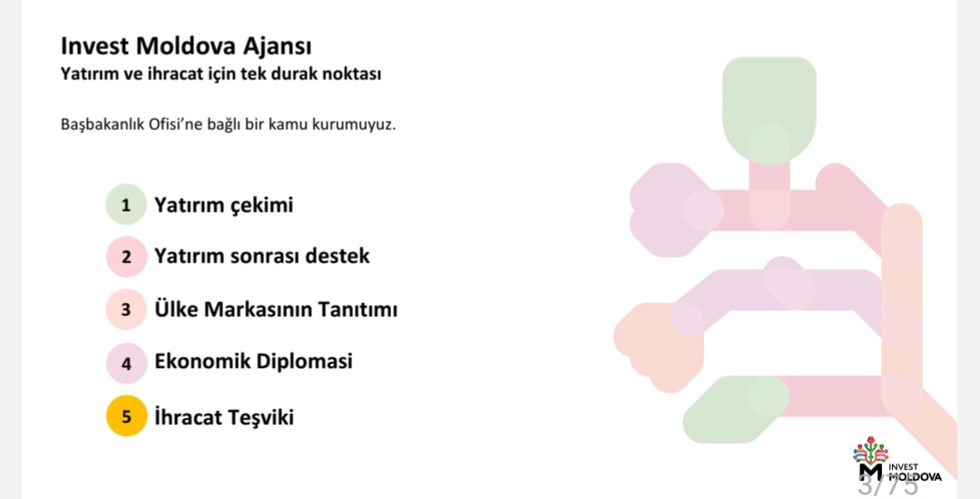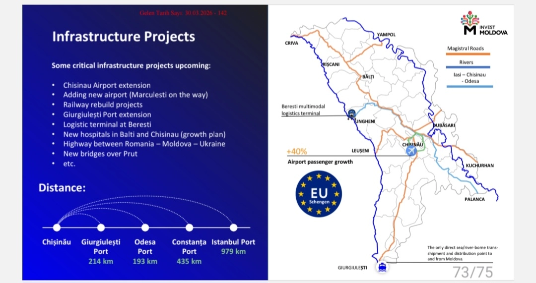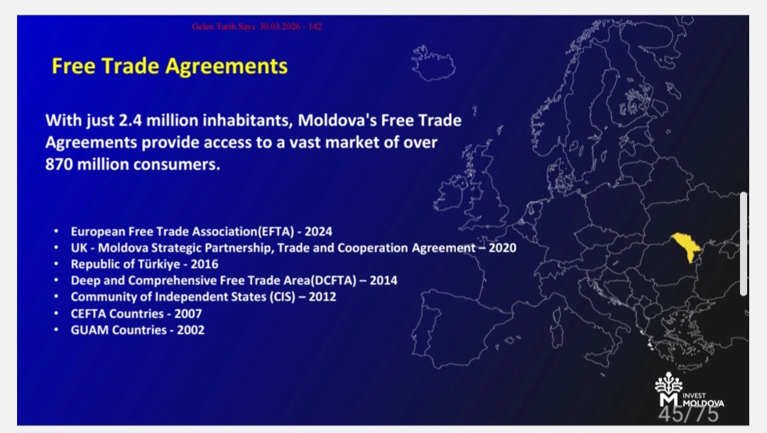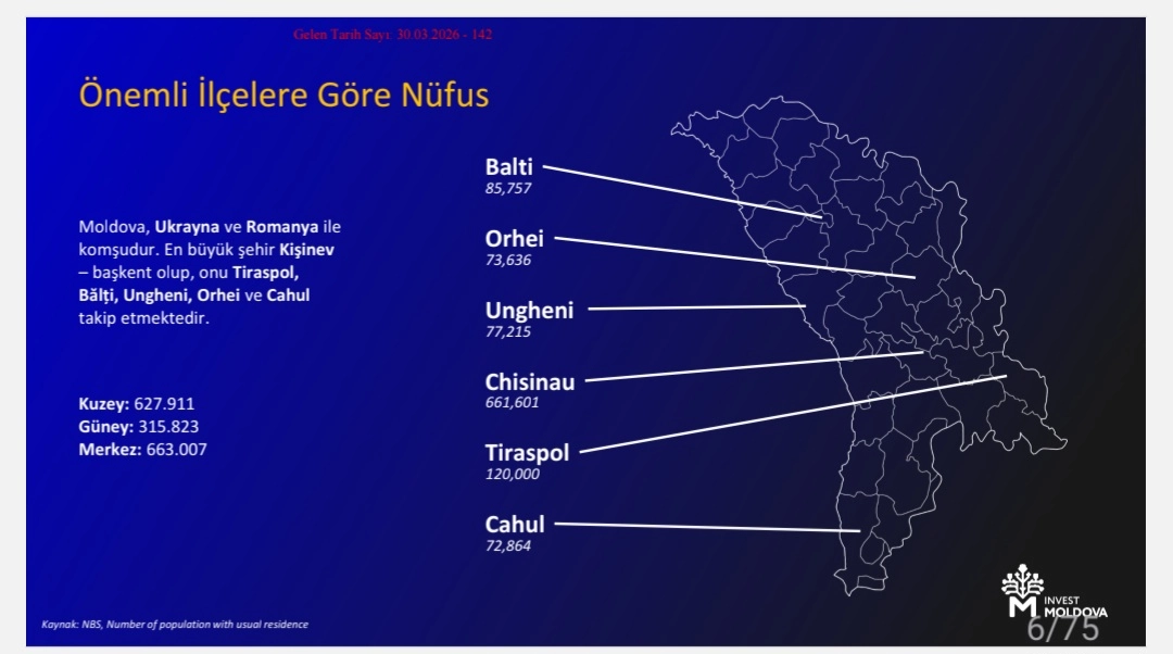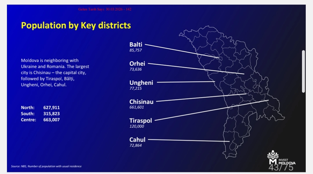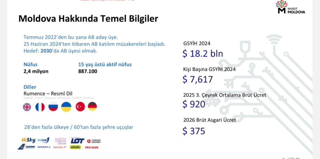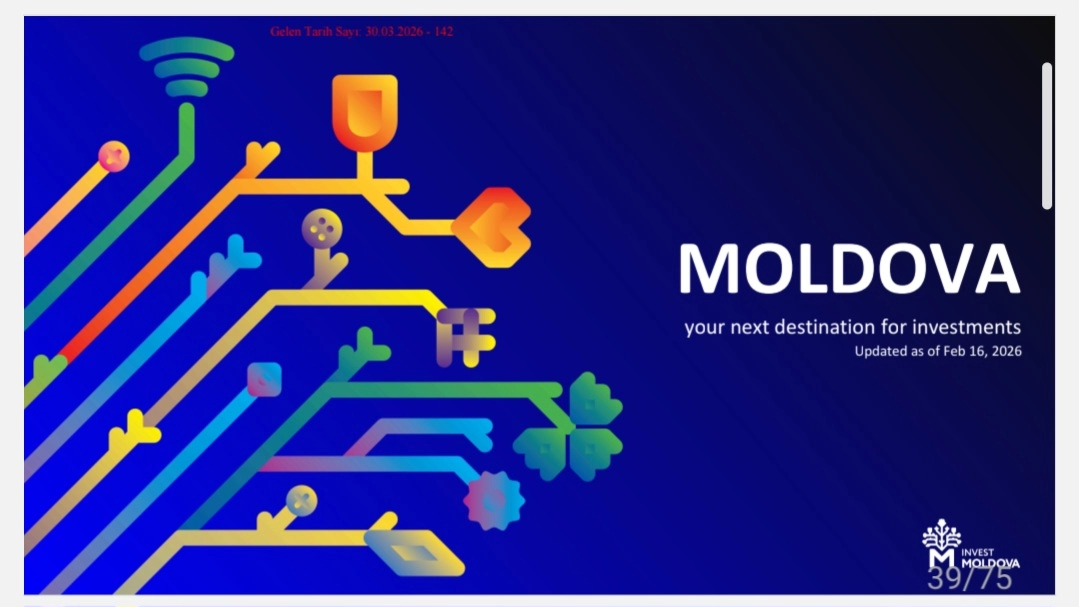 Türkiye Odalar ve Borsalar Birliği’nce tarafımıza iletilen yazıda, Moldova Cumhuriyeti Ankara Büyükelçiliği’nin ilgili yazısına atfen, Moldova Cumhuriyeti'nin demografi, ekonomi, yönetişim ve temel göstergelerine ilişkin Türkçe ve İngilizce sunumlar paylaşılmaktadır.
