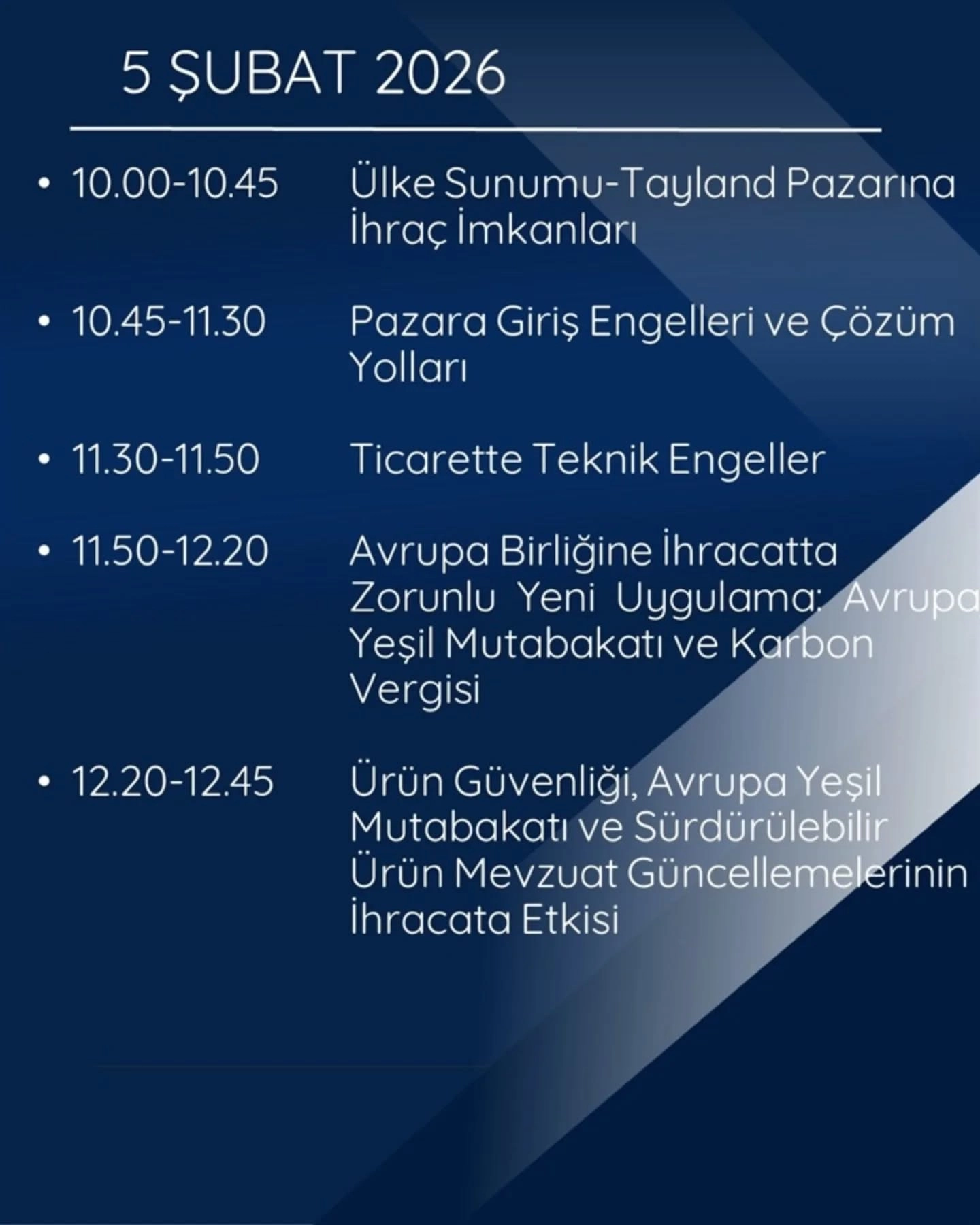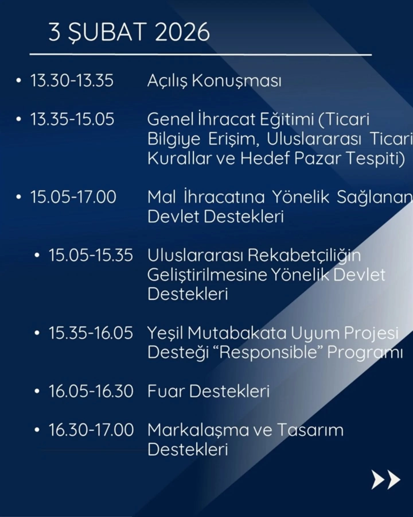 T.C. Ticaret Bakanlığı koordinasyonunda, Türkiye genelindeki iş çevrelerinin ihracat süreçlerine ilişkin olarak bilgilendirilmesini teminen düzenlenen “T.C. Ticaret Bakanlığı İhracat Süreçleri ve Devlet Destekleri Eğitim Programı” 3-4-5 Şubat 2026 tarihlerinde çevrim içi olarak gerçekleştirilecektir.