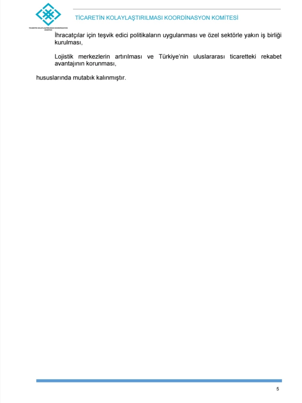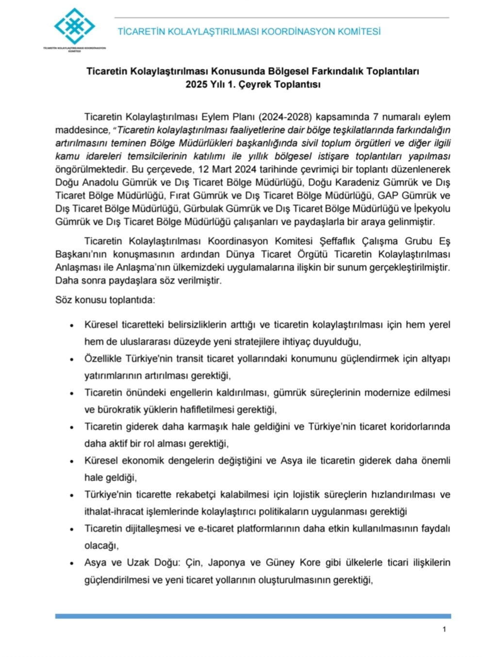 Cumhurbaşkanlığı Genelgesi ile kurulan Ticaretin Kolaylaştırılması Koordinasyon Komitesi'nin çalışmaları kapsamında, ticaretin kolaylaştırılması konusunda farkındalığın artırılmasını teminen Gümrük ve Dış Ticaret Bölge Müdürlükleri katılımı, sivil toplum örgütleri ve diğer ilgili kamu idareleri temsilcilerinin katkısı ile yıllık bölgesel istişare toplantılarının düzenlendiği belirtilmiştir.